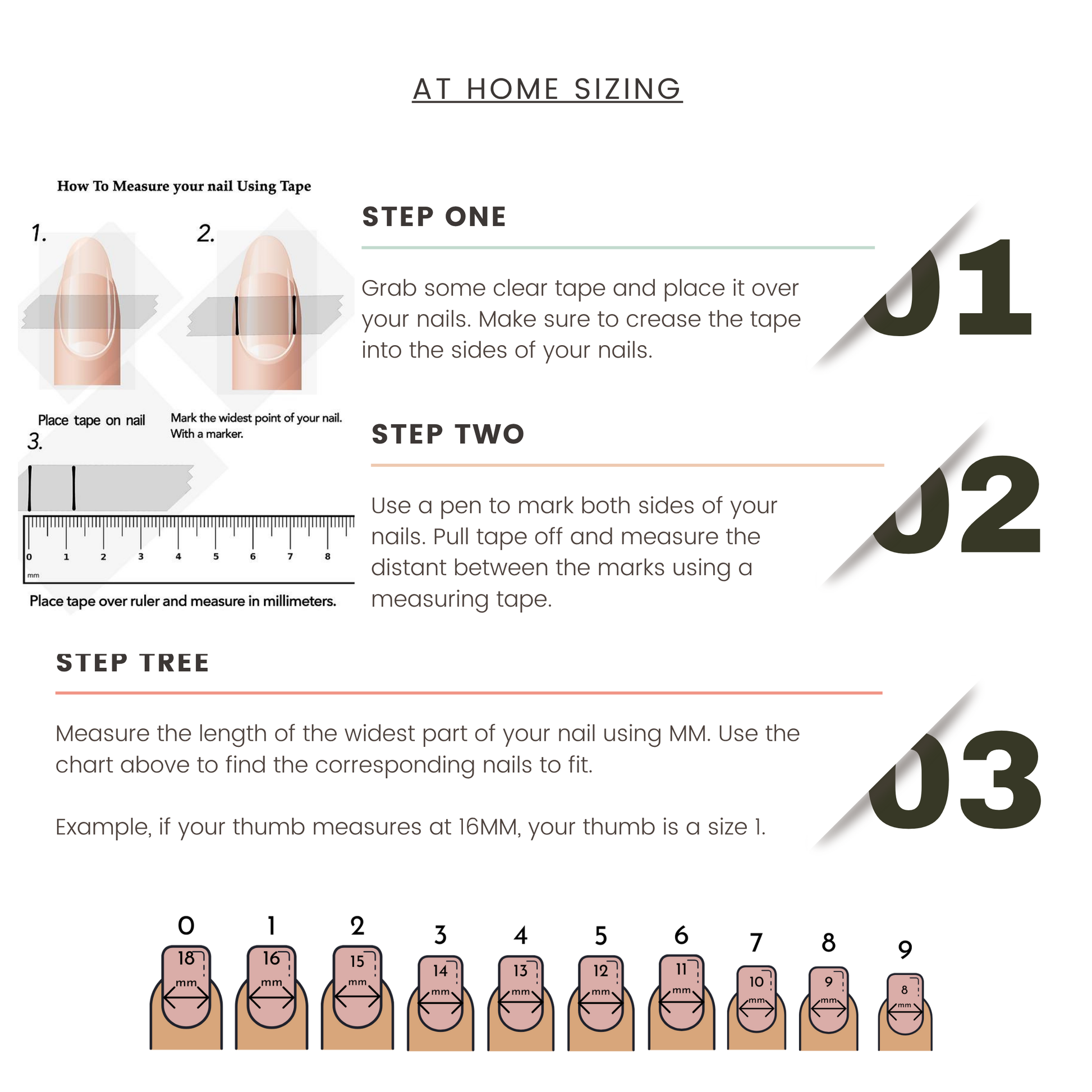 Every nail set is set to be made to fit your nails. Use the sizing guide or purchase a sizing kit for more accurate measuring.