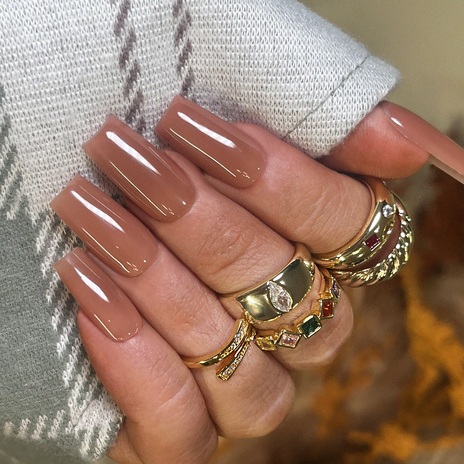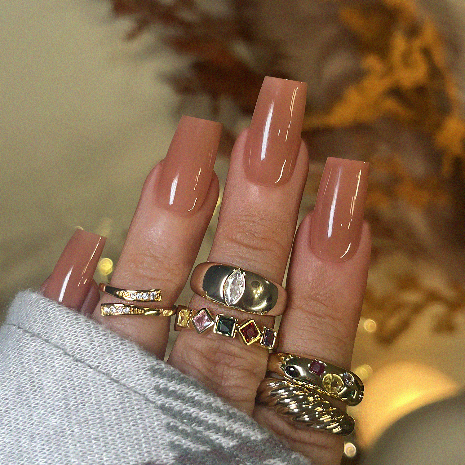 A warm nude base. Base colors can be worn on their own or typically are used as the color under a french tip/ombre/design.