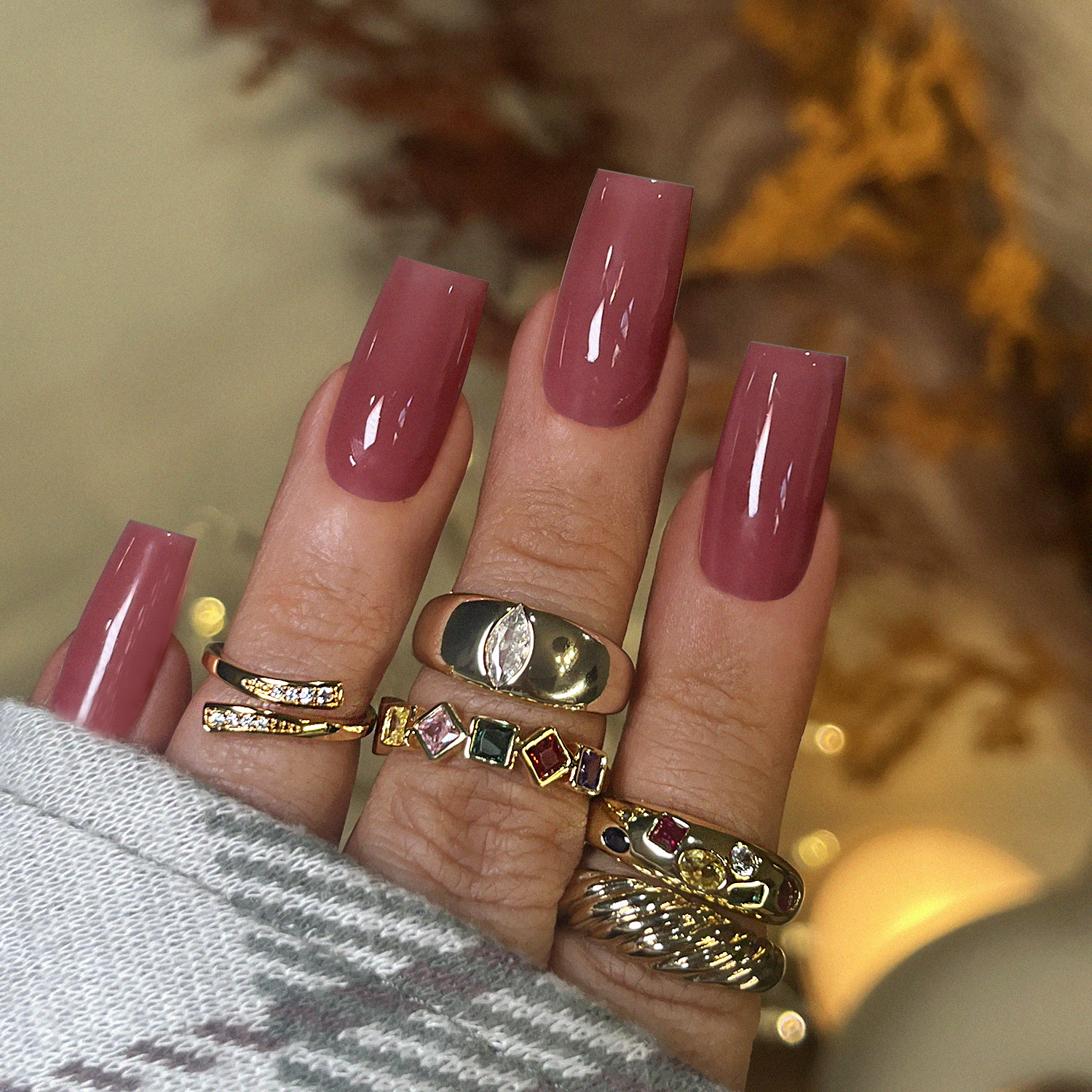 A warm berry base. Base colors can be worn on their own or typically are used as the color under a french tip/ombre/design.