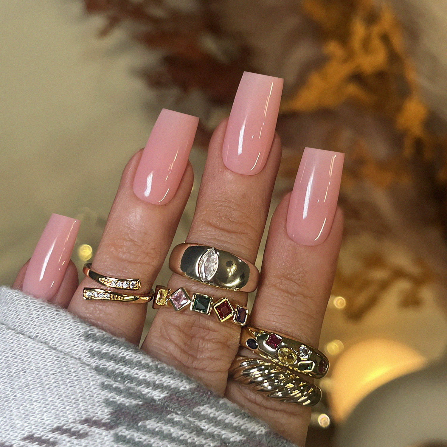 A soft peachy-pink base. Base colors can be worn on their own or typically are used as the color under a french tip/ombre/design.